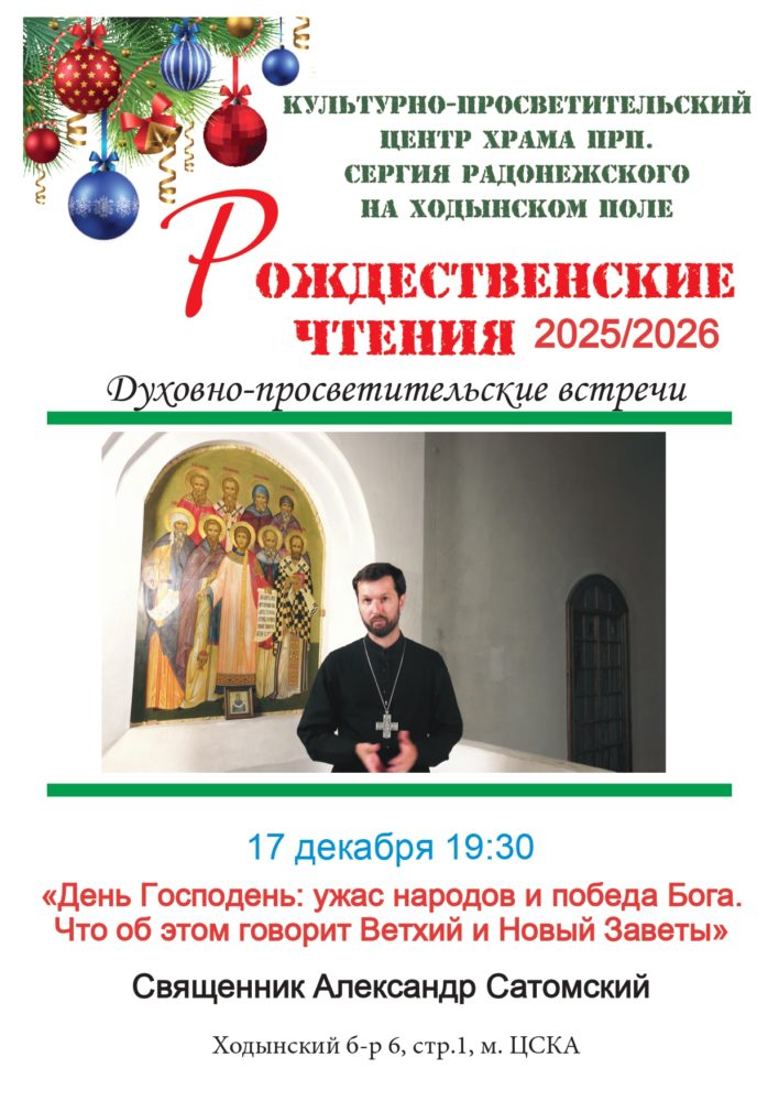 17 декабря 19:30 «День Господень: ужас народов и победа Бога. Что об этом говорит Ветхий и Новый Заветы» Священник Александр Сатомский sergiyhram 05.12.2025 АНОНСЫ МЕРОПРИЯТИЙ КУЛЬТУРНО-ПРОСВЕТИТЕЛЬСКОГО ЦЕНТРА (1) Поделиться:ВКонтактеTelegramEmailПечатьЕлицы ← 11 декабря «Религиозный символизм:история и современное развитие» Священник Максим Маслаков