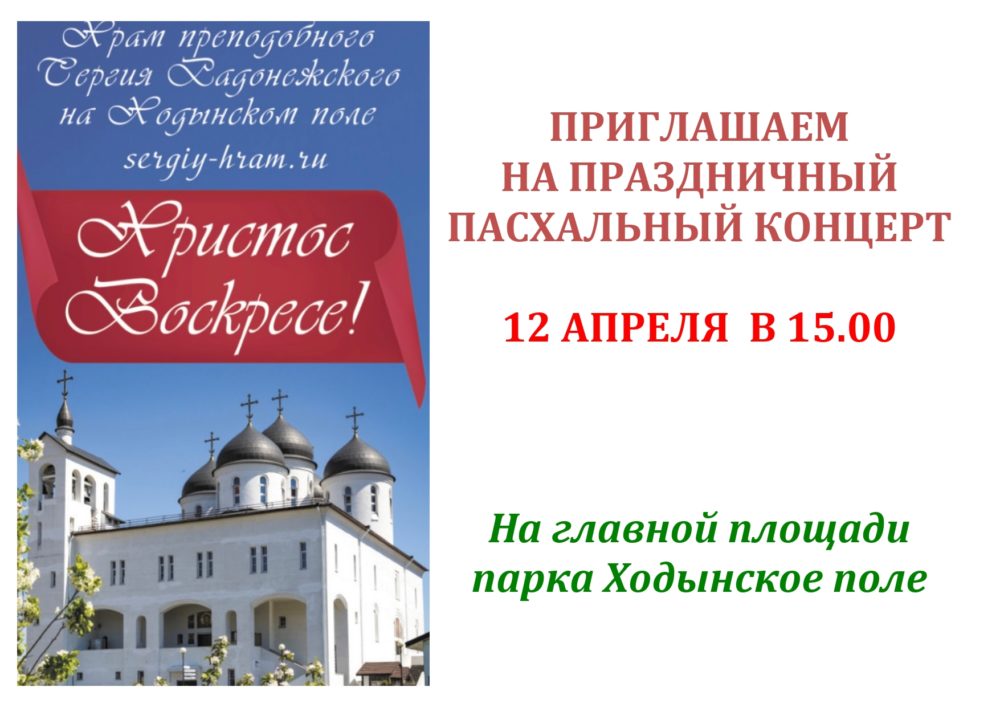 ПРИГЛАШАЕМ НА ПРАЗДНИЧНЫЙ ПАСХАЛЬНЫЙ КОНЦЕРТ 12 АПРЕЛЯ В 15.00!! sergiyhram 07.04.2026 АНОНСЫ МЕРОПРИЯТИЙ КУЛЬТУРНО-ПРОСВЕТИТЕЛЬСКОГО ЦЕНТРА (3) Поделиться:ВКонтактеTelegramEmailПечатьЕлицы ← Предпасхальные художественные мастер-классы прошли в культурно-просветительском центре Храма прп. Сергия Радонежского на Ходынском поле.